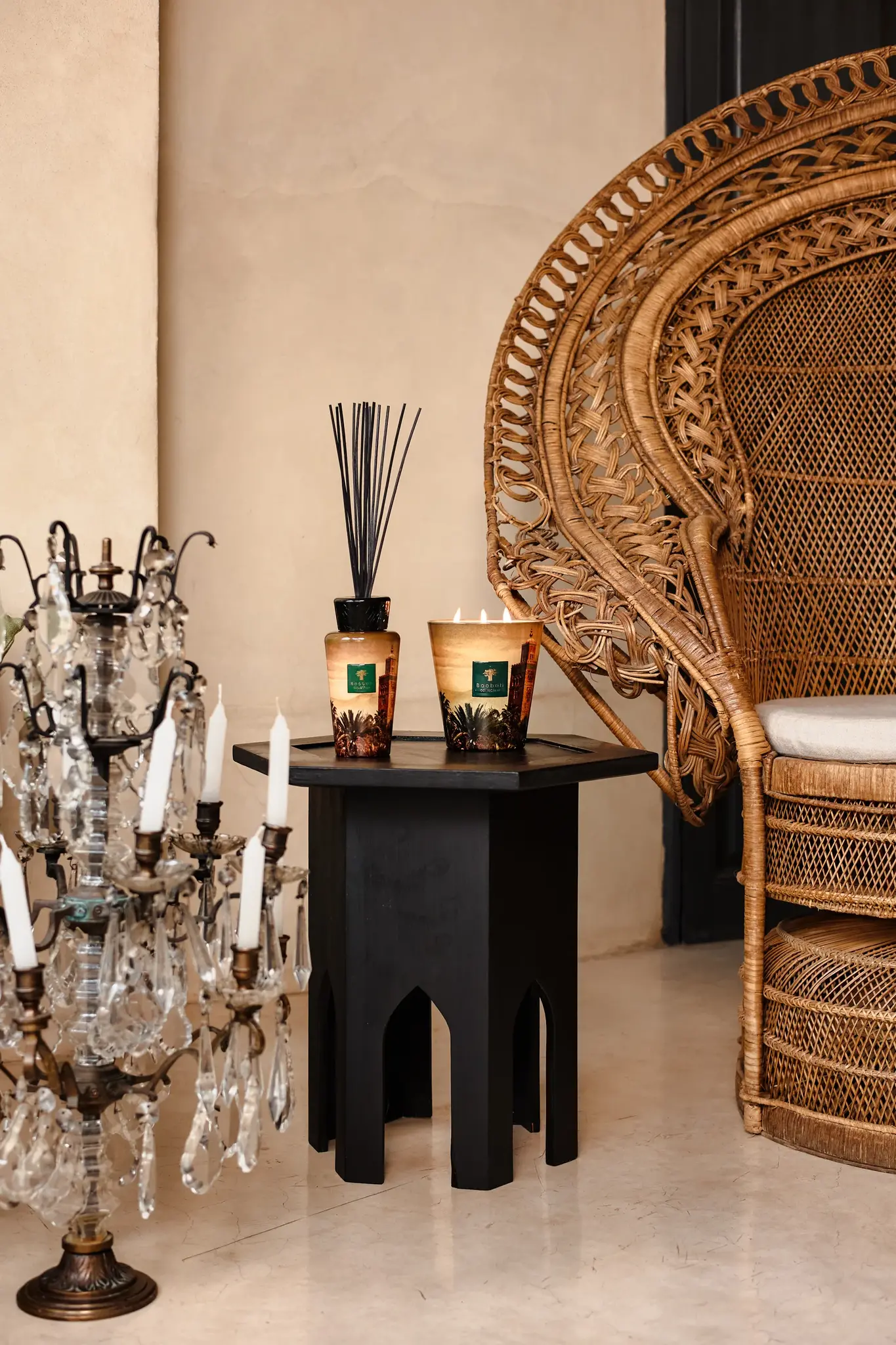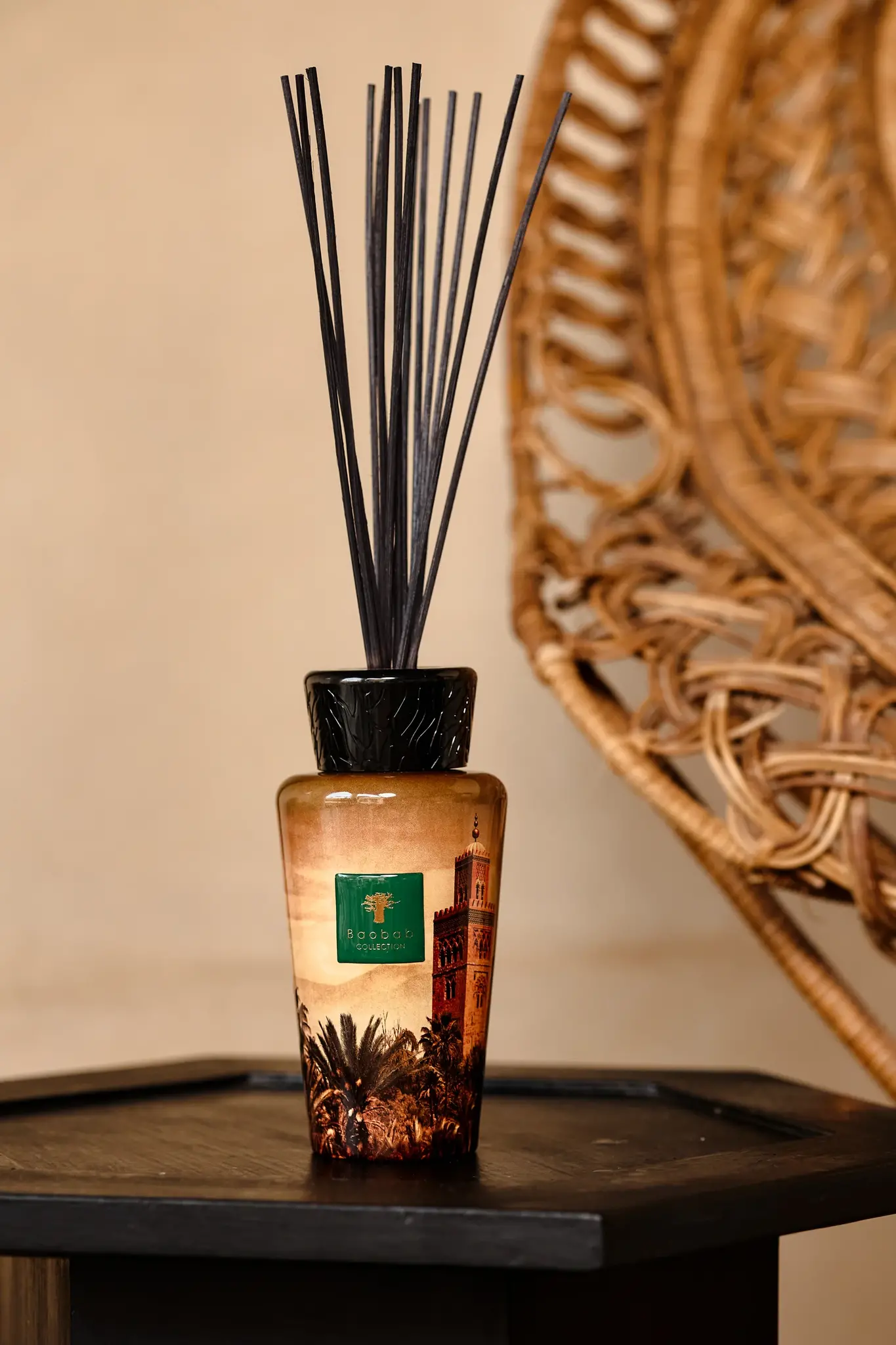 Geurprofiel: De diffuser verspreidt een warme, oriëntaalse geur met noten van wierook, atlasceder en luxe leder. Deze geur roept de sfeer op van een wandeling door de soeks van Marrakesh, waar rijke, kostbare aroma’s je zintuigen prikkelen.