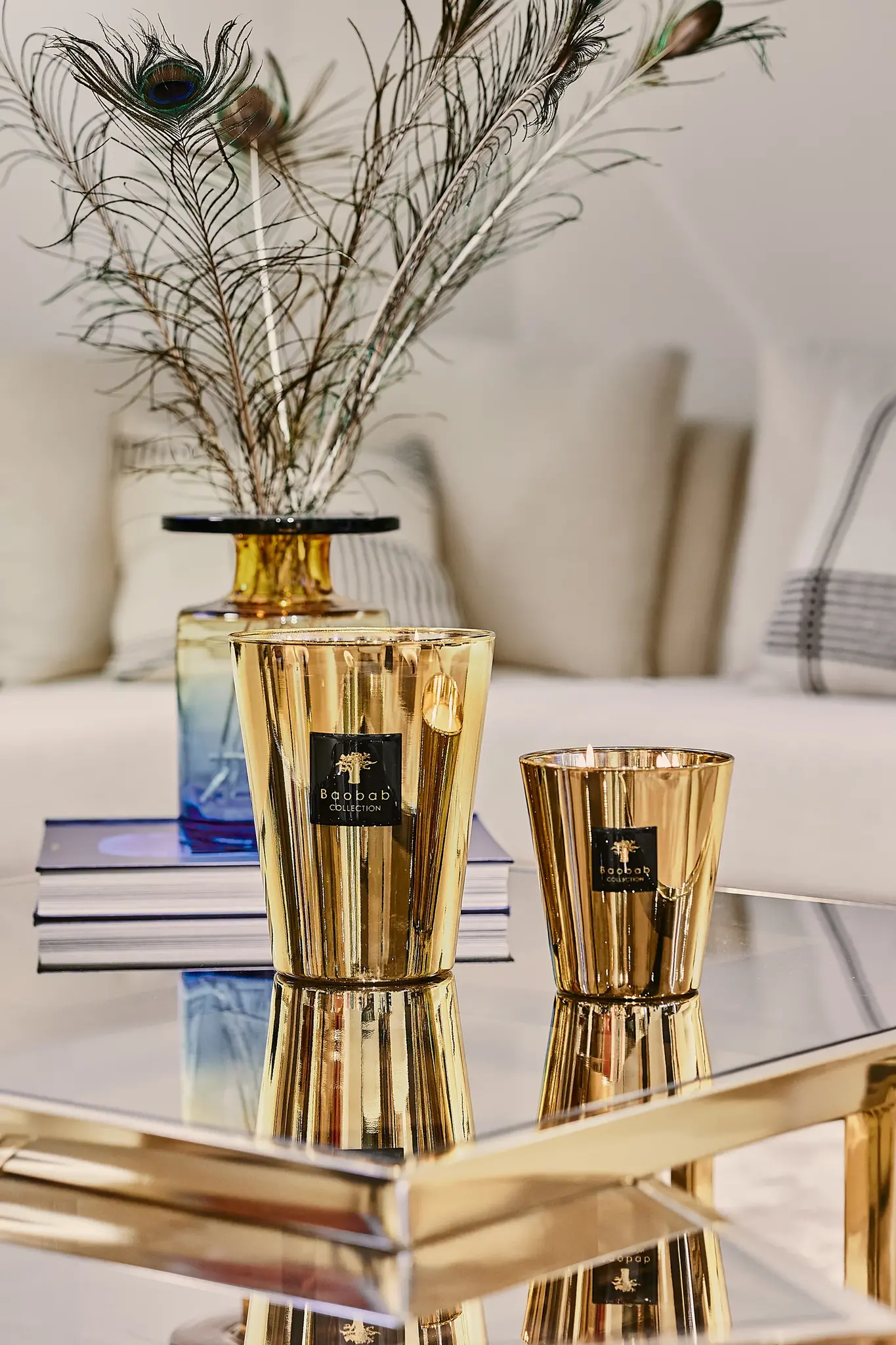 Ontdek de Baobab Aurum, een luxe geurkaars die beschikbaar is in verschillende maten. De met de hand gegoten glazen vaas, afgewerkt in metallic goud, geeft een prachtig effect wanneer de kaars brandt en voegt een vleugje elegantie toe aan elk interieur.