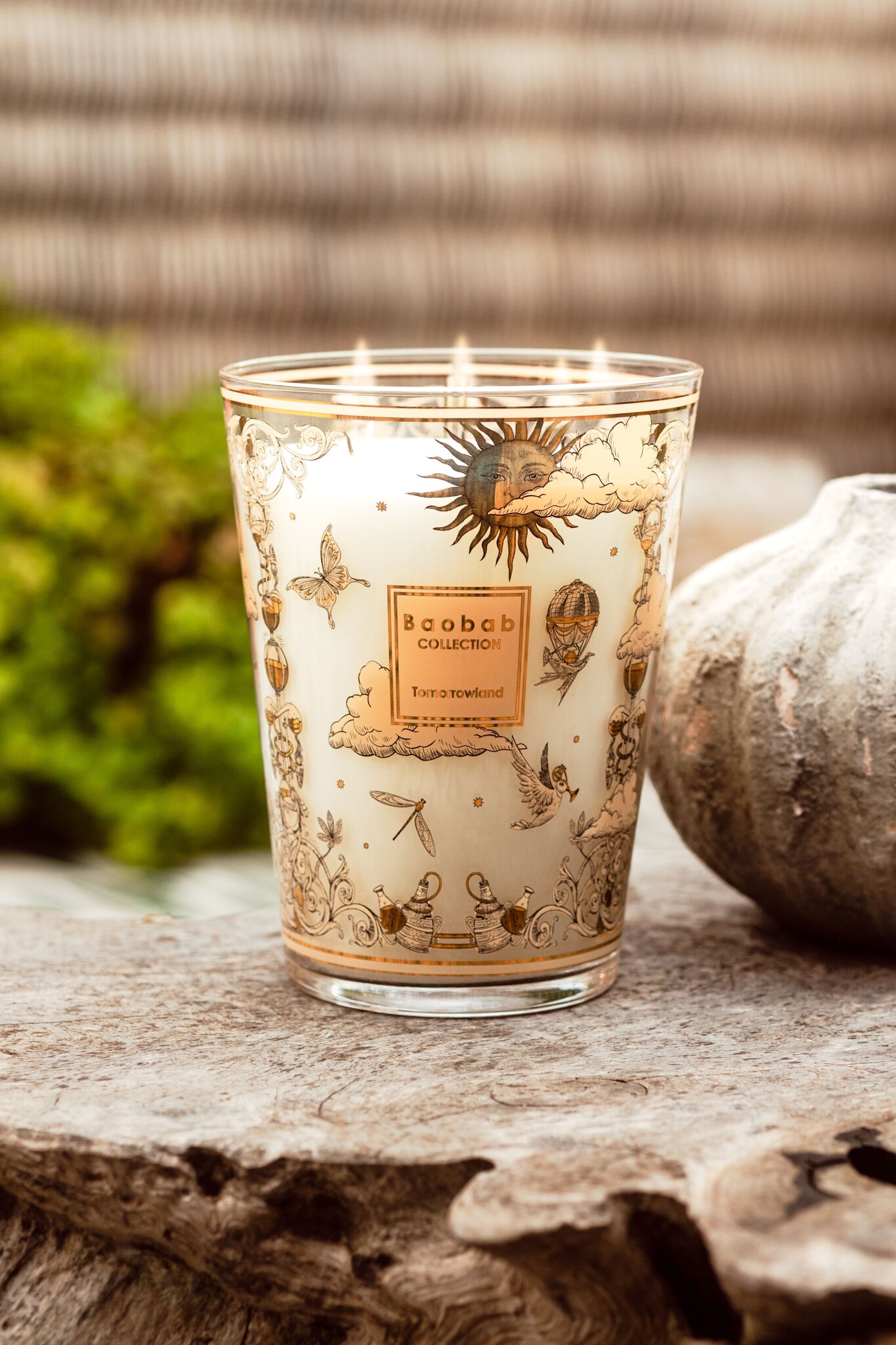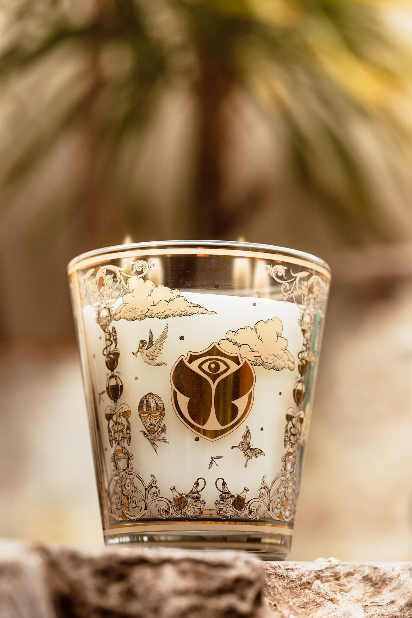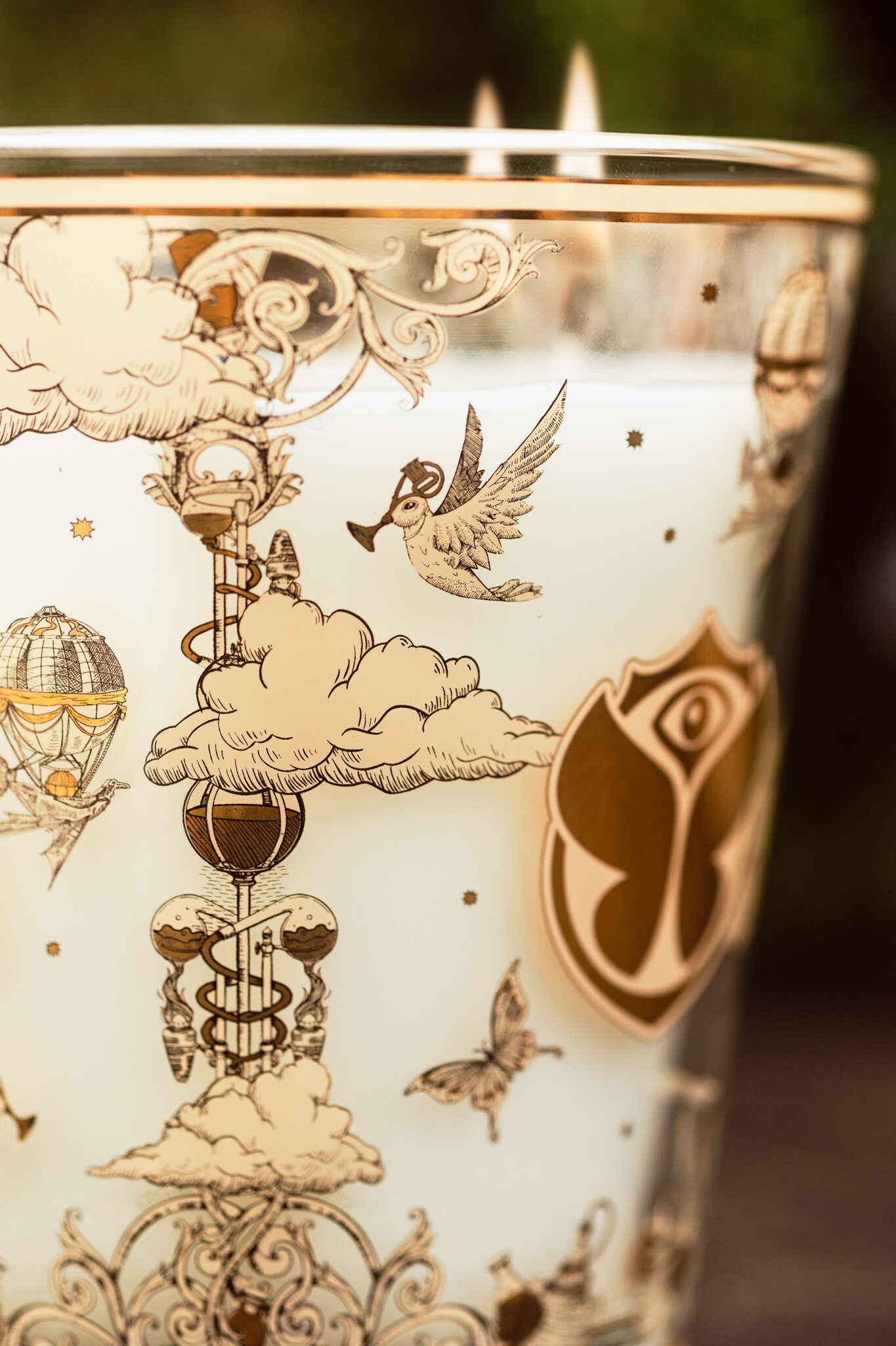 De kaars is gehuld in een luxueuze pot met een gezeefdrukte gouden en zwarte decoratie, geïnspireerd op 19e-eeuwse gravures. Vlinders en heteluchtballonnen sieren het glas in een denkbeeldige vlucht, wat je meeneemt naar de magische wereld van Tomorrowland. Dit maakt de kaars niet alleen een geurervaring, maar ook een stijlvol decoratiestuk voor je interieur.