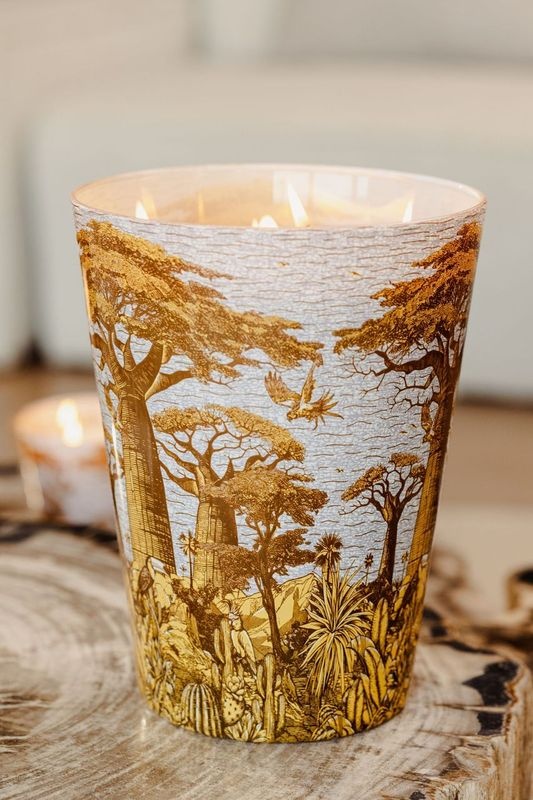 Breng luxe en verfijning in je interieur met de Baobab Collection Sacred Trees Cocody Geurkaars, verkrijgbaar bij GRAUS wonen. Deze luxe geurkaars is niet alleen een geurervaring, maar ook een kunstwerk dat sfeer, stijl en de kracht van natuur combineert. De prachtige decoratie op het glas van de Cocody-kaars is geïnspireerd door de baobabs van de regio Cocody in Ivoorkust. Dit ontwerp wordt vervaardigd in Italië met behulp van een geavanceerde glassublimatiemethode. De natuurlijke pigmenten die worden gebruikt voor het drukproces zorgen voor een levendig en gedetailleerd ontwerp met een prachtige grijze achtergrond en gele baobabs. De kaars heeft een bijzondere kwaliteit: door de vlam komt het ontwerp subtiel tot leven met een transparante uitstraling die de kaars een extra dimensie geeft.