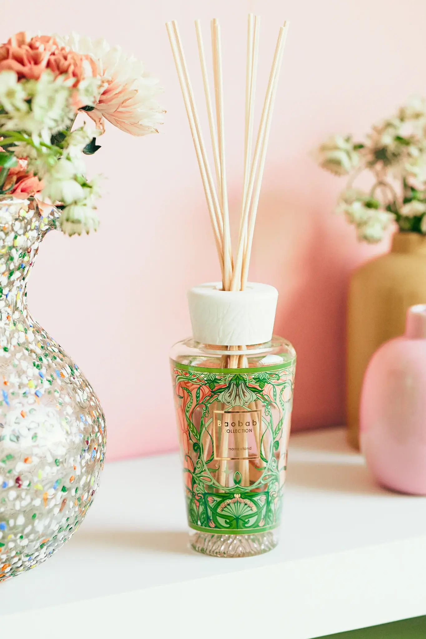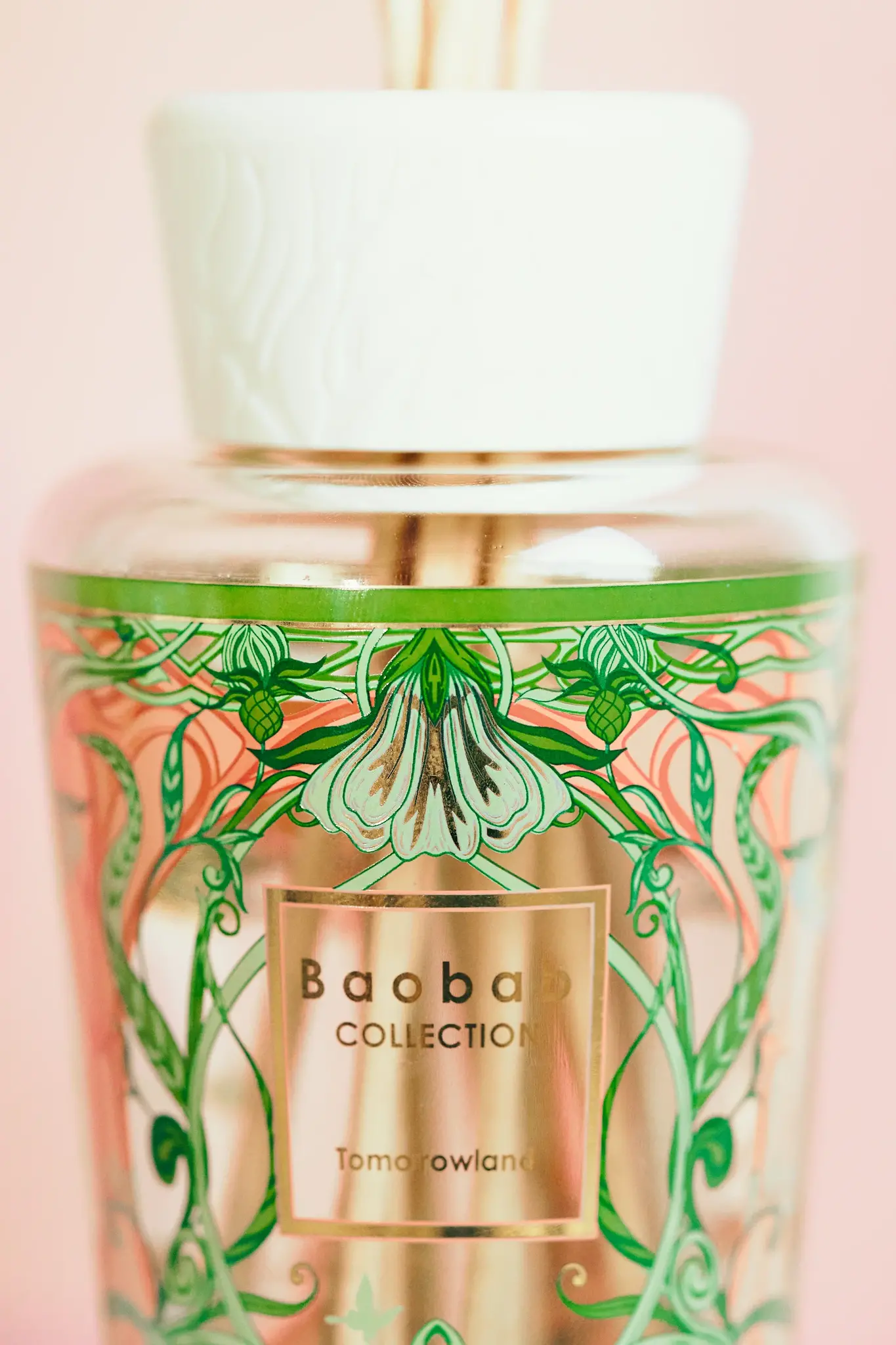 Ontdek de magische sfeer van Tomorrowland bij jou thuis met de Baobab Collection Diffuser 250 ml My First Baobab Tomorrowland 2024. Deze prachtige diffuser is voorzien van een uniek art-nouveau design, geïnspireerd door de natuur, met een zacht roze en groen kleurenschema en het herkenbare logo van het Belgische muziekfestival Tomorrowland.