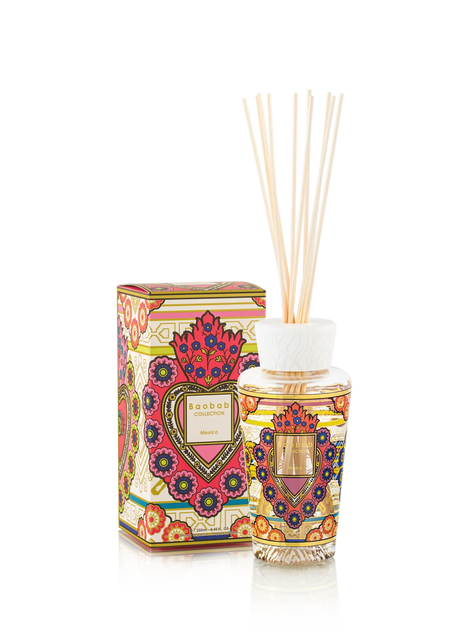 Breng de levendige geuren en kleuren van Mexico in huis met de My First Baobab Mexico diffuser. Deze luxe diffuser is gedecoreerd met een gekleurde en gouden zijdeschermafdruk van een ex-voto hart, dat symbool staat voor dankbaarheid en wensvervulling. De motieven, geïnspireerd door Mexicaanse ambachten en de corsages van Frida Kahlo, sieren het glas, wat het tot een stijlvol object maakt dat niet alleen geur verspreidt, maar ook je interieur verrijkt.