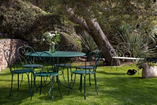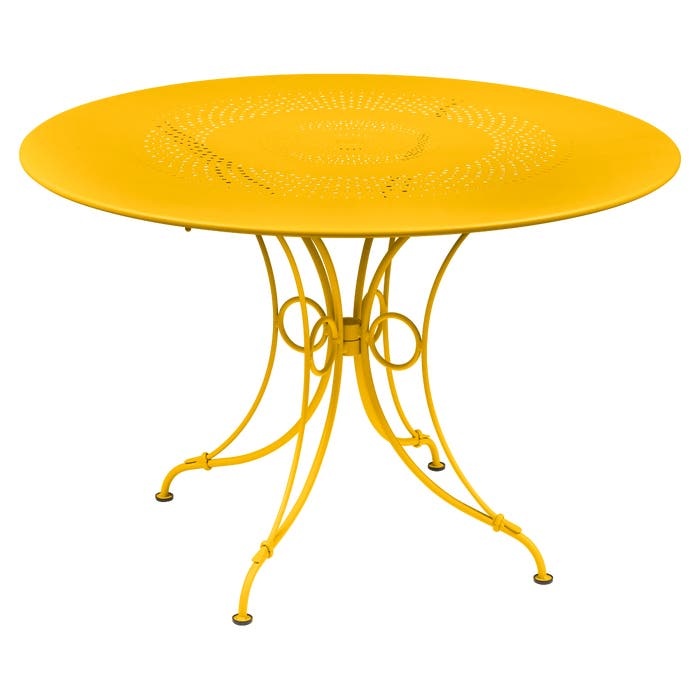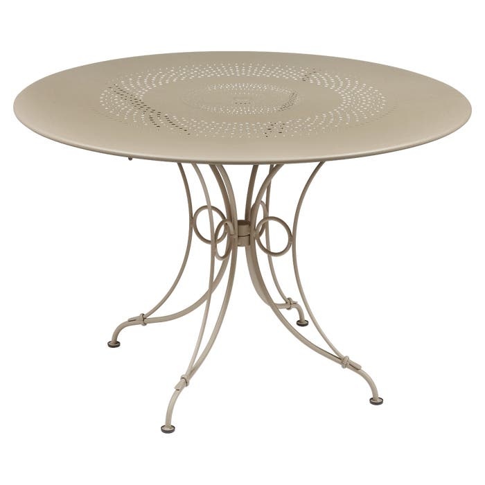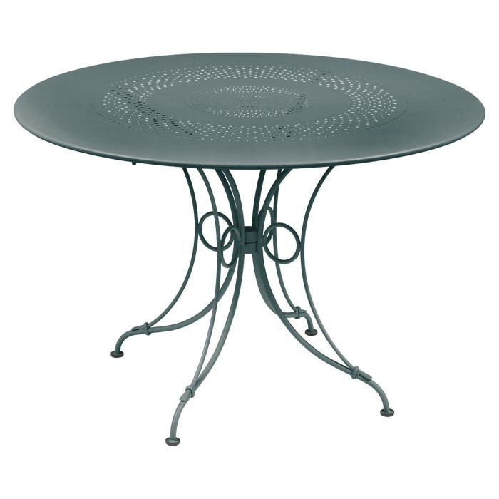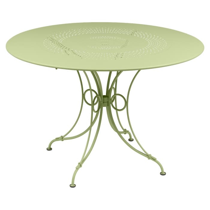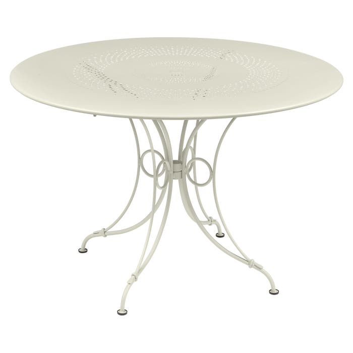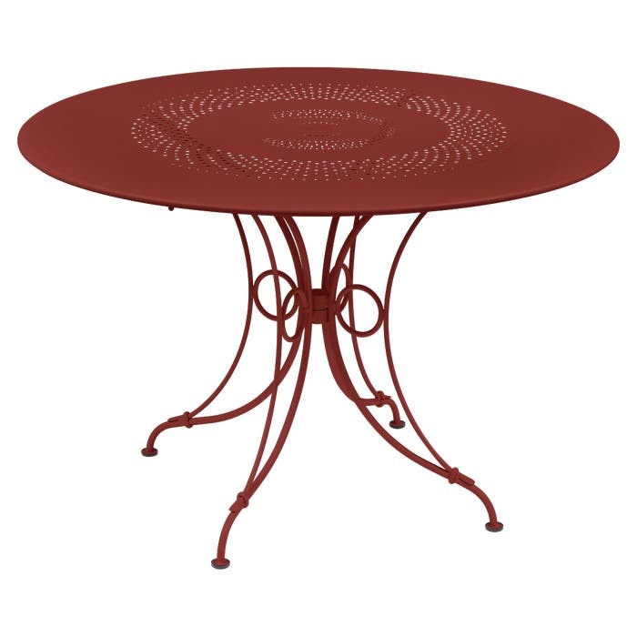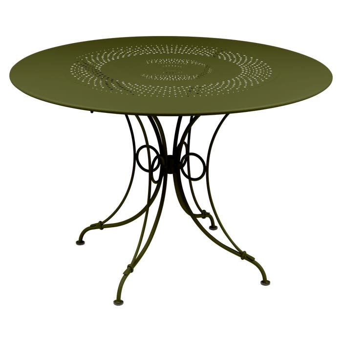 De tafel is vervaardigd uit hoogwaardig, geperforeerd staal dat is afgewerkt met een UV-bestendige en weersbestendige coating. Hierdoor blijft de kleur langdurig mooi en is de tafel bestand tegen zonlicht, regen en andere weersinvloeden. De robuuste stalen draadbasis is met de hand gesmeed, wat zorgt voor een authentieke uitstraling en uitstekende stevigheid. De kenmerkende handgesmede ringen op de tafelpoten benadrukken het Franse vakmanschap van Fermob en geven de tafel een uniek karakter.