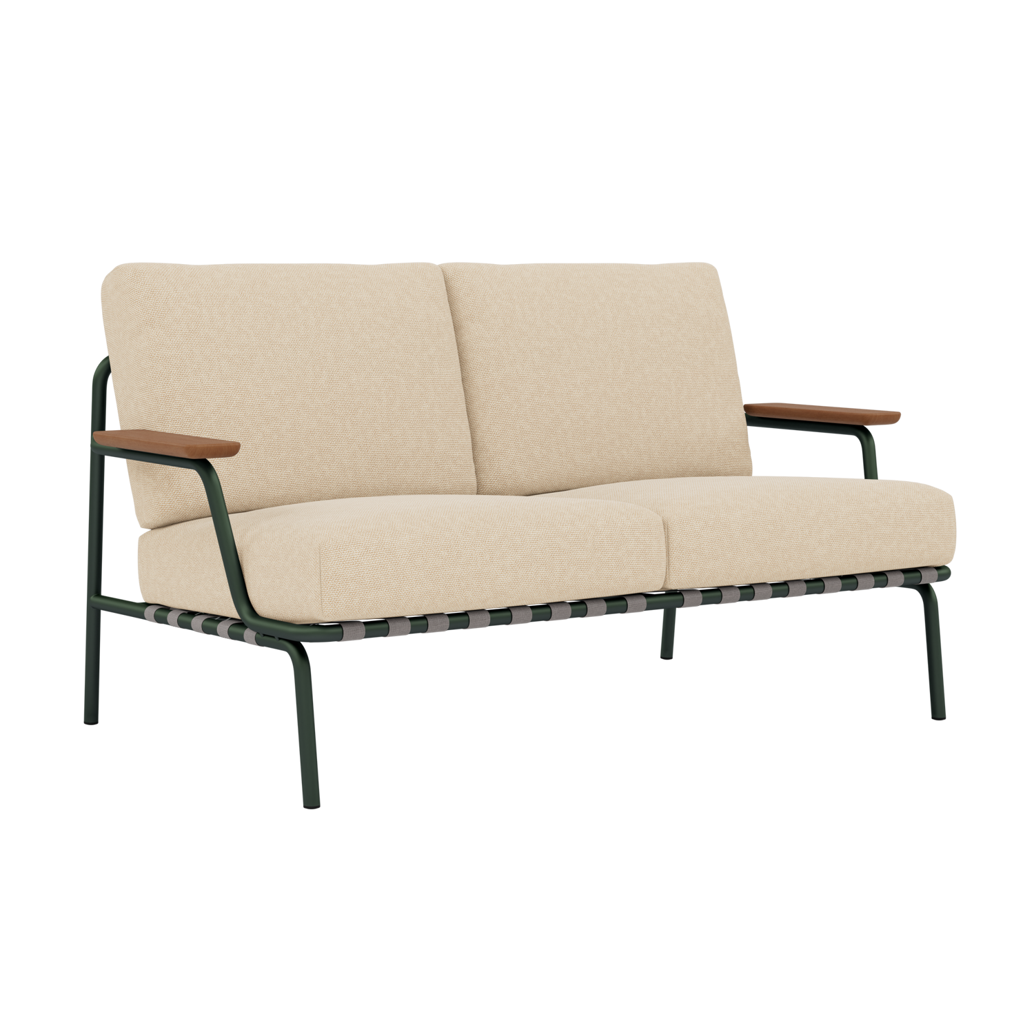De Settle Sofa is een blikvanger in elke buitenruimte. Het lichte, luchtige stalen frame geeft de bank een moderne uitstraling, terwijl de FSC™-gecertificeerde mahoniehouten armleuningen een warme, natuurlijke touch toevoegen. De verfijnde details in het frame en de zichtbare riemen geven de sofa een elegante en uitnodigende look vanuit elke hoek.