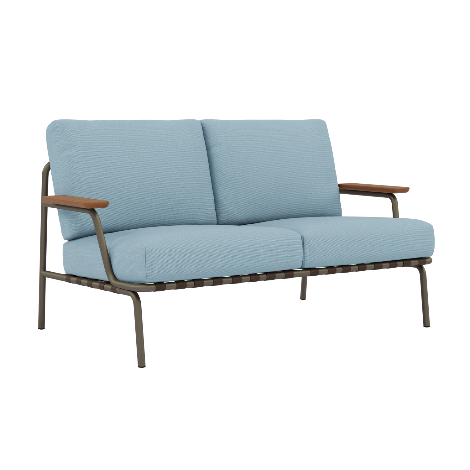 Stijlvol & Modern Design: Het luchtige stalen frame in taupe geeft de sofa een hedendaagse uitstraling. De armleuningen zijn gemaakt van FSC™-gecertificeerd mahoniehout, wat zorgt voor een warme, natuurlijke look. De gedetailleerde afwerking en zichtbare riemen maken deze buitenbank een blikvanger vanuit elke hoek.