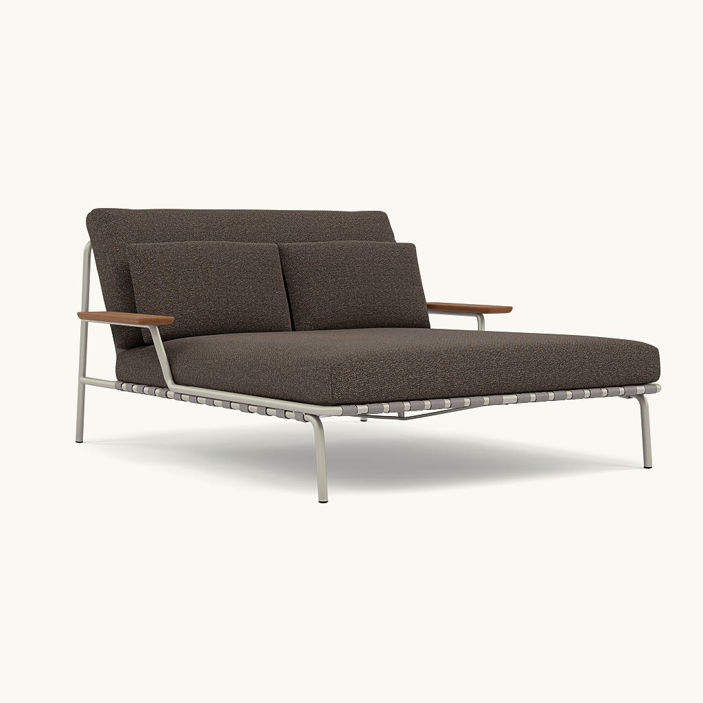 Het grijze, gepoedercoate stalen frame geeft dit ligbed een moderne en verfijnde uitstraling, terwijl de armleuningen van FSC™-gecertificeerd sapele mahoniehout zorgen voor een natuurlijke, warme touch. De verfijnde Laze-bekleding is gemaakt van duurzame, weerbestendige outdoor stof die bestand is tegen zon, regen en dagelijks gebruik. Dankzij de quick-dry foam vulling blijven de kussens comfortabel en snel droog, zelfs na een zomerse regenbui.