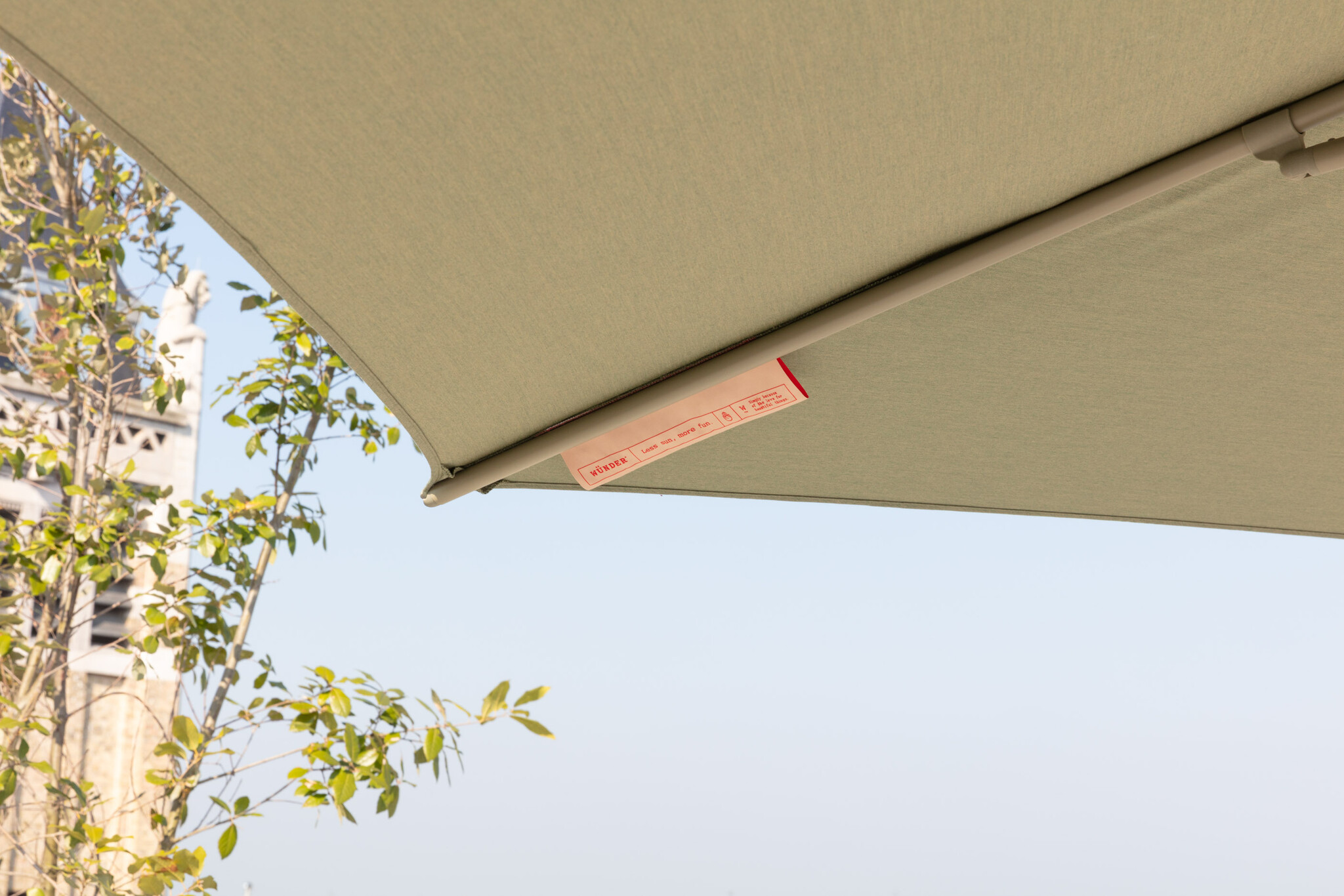 Dankzij de hoogwaardige Sunbrella-stof en een stevig, gepoedercoat aluminium frame, is ‘The Shadow’ volledig bestand tegen wind, zon en regen. Met een robuuste basis van 40 kg trotseert deze parasol zelfs windkracht 6 op de schaal van Beaufort.