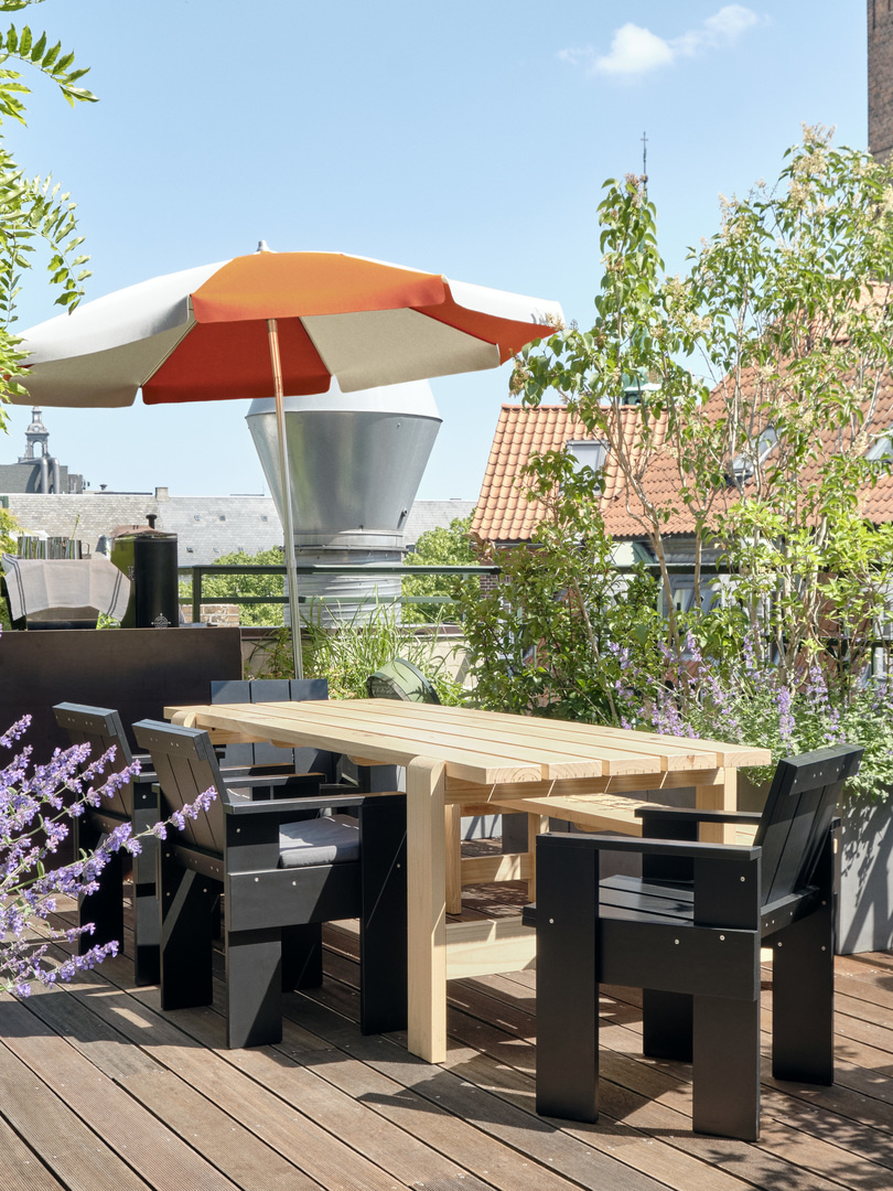 De HAY Weekday Table is ontworpen door Hannes & Fritz en brengt het gevoel van samenzijn tot leven. Geïnspireerd op de klassieke picknicktafel, combineert deze eettafel een stoer karakter met zachte, afgeronde vormen die warmte en gezelligheid uitstralen. Dankzij het gebruik van massief dennenhout en een duurzame watergedragen lak is de tafel bestand tegen verschillende weersomstandigheden en perfect geschikt voor buitengebruik.