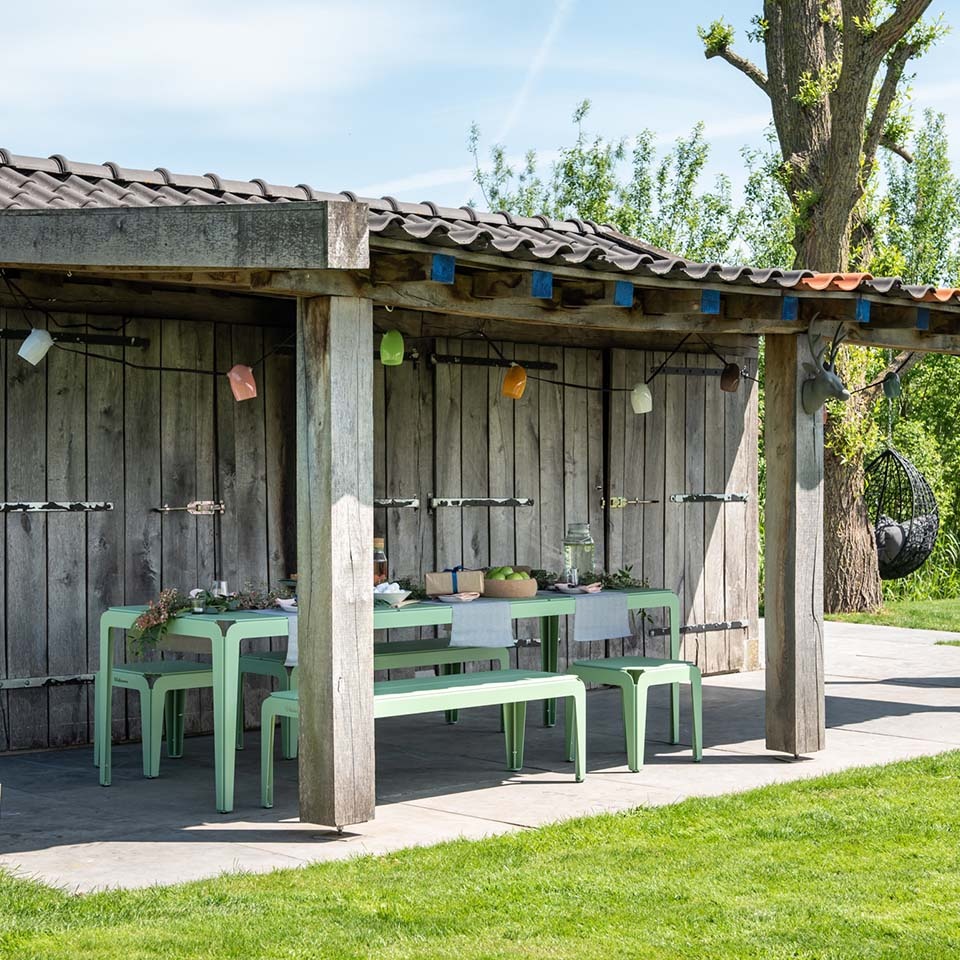 Deze tafel maakt deel uit van de Bended Series, ontworpen door Jaïr Straschnow, en is vervaardigd uit 100% recyclebaar 3mm aluminium. Dit garandeert niet alleen een duurzaam en milieuvriendelijk product, maar ook een onderhoudsvriendelijke en robuuste buitenmeubel. De Weltevree Bended Table is verkrijgbaar in een scala aan prachtige kleuren, waaronder lichtgroen, grijsblauw en agate grijs, waardoor je de vrijheid hebt om een stijl te kiezen die past bij jouw persoonlijke voorkeur en buitenruimte.